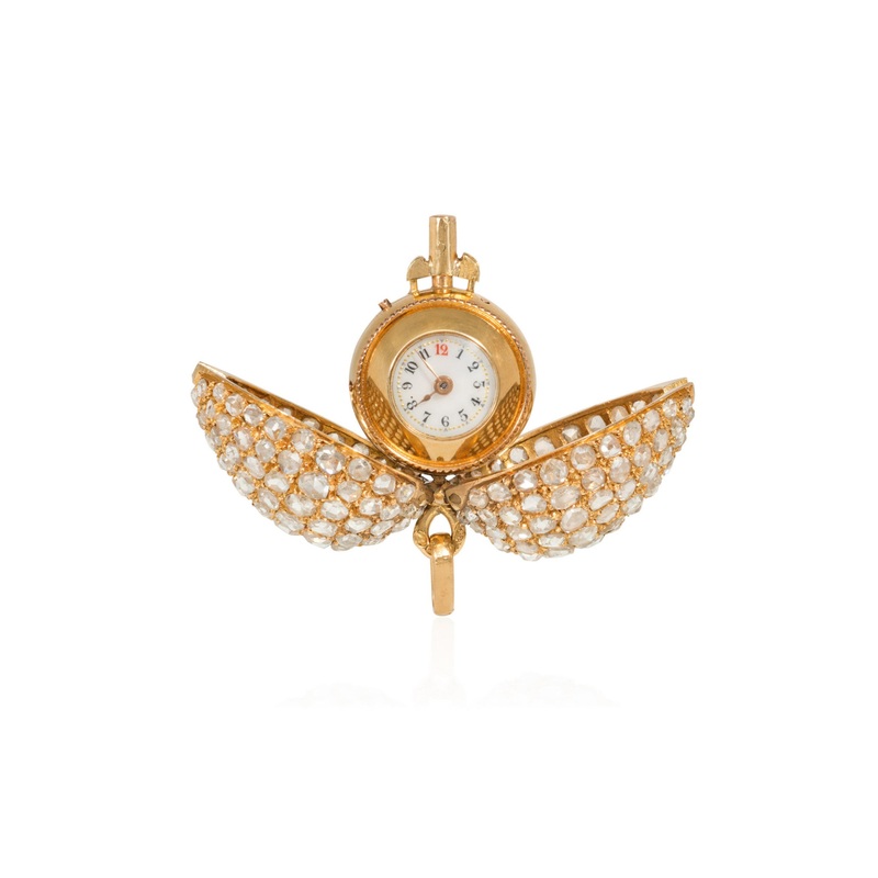 This antique Swiss diamond egg-shaped watch pendant is a unique piece of Victorian-era jewelry. Crafted by E. Gasser in Geneva, Switzerland, the pendant features an 18kt yellow gold concealed watch within a rose-diamond egg that opens to reveal a clock wit