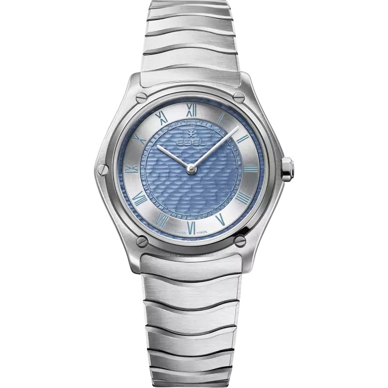 Ebel Sport Classic Watch 1216703. Womens EBEL Sport Classic watch, stainless steel case, 33mm, light blue and silver dial with Roman numerals engraved and painted in blue, wave textured pattern, sapphire crystal with antireflective treatment underneath, stainless steel wave link bracelet with a folding clasp, Swiss quartz movement, water resistant up to 5 bar.
