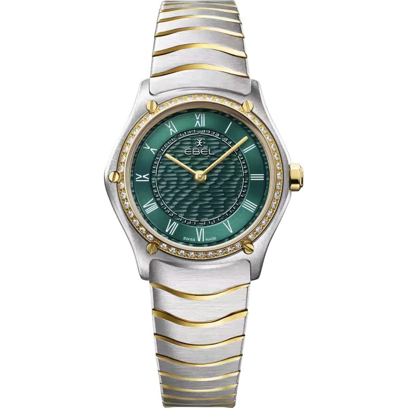 Ebel Sport Classic Watch 1216702. Womens EBEL Sport Classic watch, stainless steel and 18K yellow gold case with 47 diamonds (0.3055ct), 29mm, deep green dial with Roman numerals engraved and painted in white, wave textured pattern, sapphire crystal with antireflective treatment underneath, two tone stainless steel wave link bracelet with a folding clasp, Swiss quartz movement, water resistant up to 5 bar.