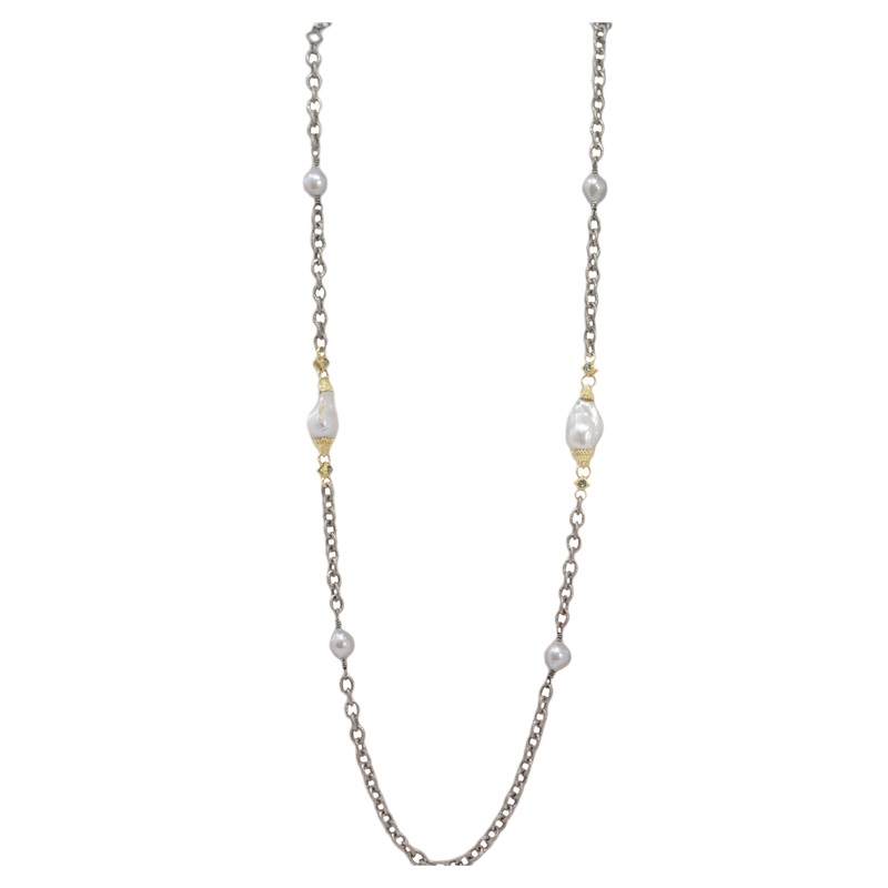 18k Yellow Gold and Sterling Silver 34" grey cable chain with Baroque Pearl stations set with Montana sapphires and Silver Edison Pearl stations. Adjustable at 30", 32" and 34" with toggle closure.