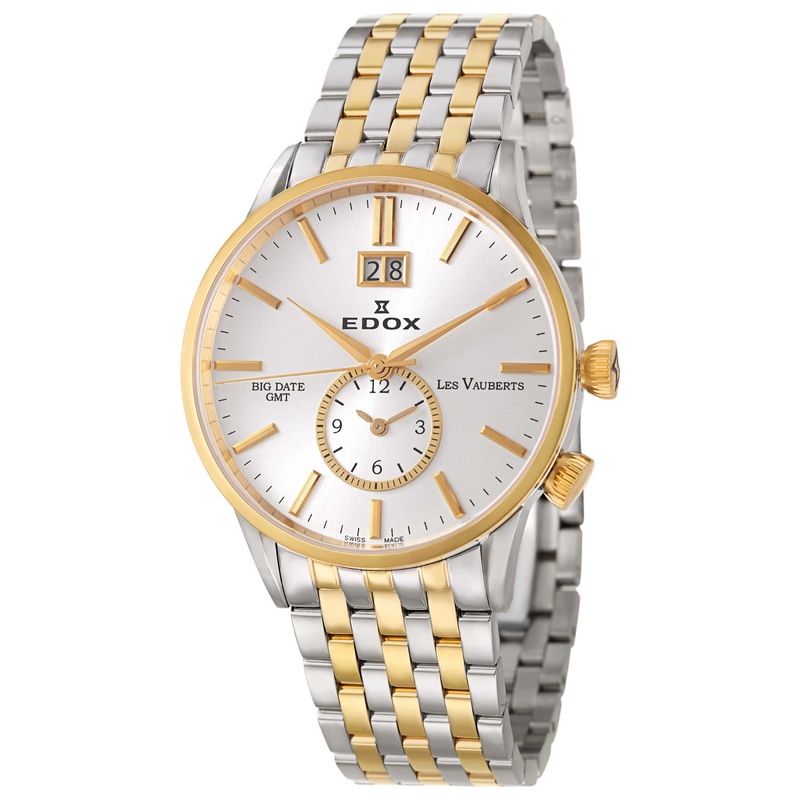 Edox, Les Vauberts Big Date GMT, Men's Watch, Stainless Steel and Yellow Gold Plated Case, Stainless Steel and Yellow Gold Plated Bracelet, Swiss Quartz (Battery-Powered), 62004-357-AID