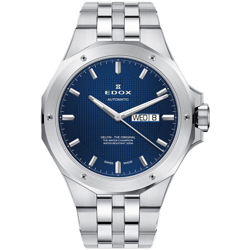 Edox Watch Delfin Automatic Day Date 88005 3M BUINX. Assembled by master watch makers, engineered for champions, for more than 130 years, Edox watches have combined ultimate precision with ingenious solutions, even for the most demanding activities: be it above or below the water surface, in the eternal ice or even on glowing desert sand, any timing instrument from Edox carrying the legendary hourglass logo will meet even the highest demands of its owner.