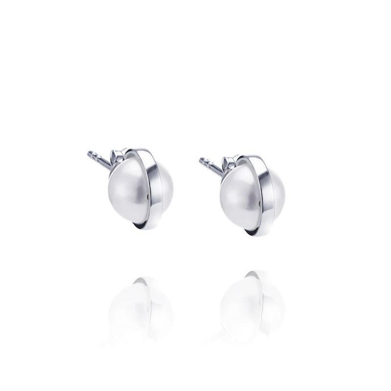 Efva Attling Day Pearl pearl earrings feature beautiful freshwater pearls, and a gold ring running from the top of the pearl. The earrings reflect femininity and soft strength. The earrings are made of 18 carat recycled white gold and freshwater pearls. The freshwater pearl has a diameter of 7.5 mm and the total height of the earring is 9.5 mm.