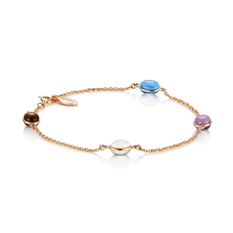 The Efva Attling Love Beads Flow bracelet features four gemstones: smoky quartz, blue topaz, amethyst and green quartz.The bracelet is made of 18 carat recycled yellow gold and the chain length is adjustable in two different lengths, 17 cm and 19 cm.