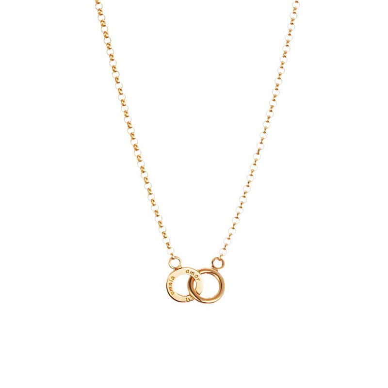 Efva Attling Mini Twosome necklace in yellow goldThe Efva Attling Mini Twosome necklace features two rings linked together, one round and one flat, like two different people complementing each other and forming a stronger union. The second ring bears the t