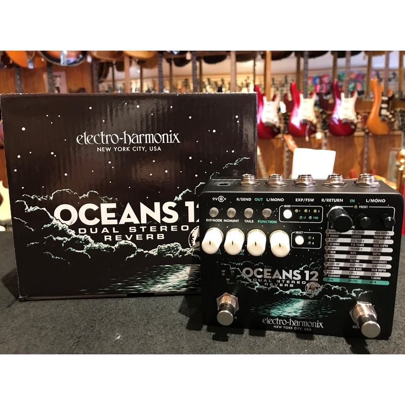The Oceans 11 s big brother with even more reverbs and functionality. It features two simultaneous, independent, stereo reverb engines, series and parallel control for the dual reverbs, 24 presets and advanced I/O allowing for stereo in/out or mono send/return with pre and post reverb options. The pedal also includes a new Tide Control for stereo image alteration, a Lo-fi Control, an infinite attenuation control and an input jack for external expression and 3-button footswitch control. A Tails switch provides a choice of whether the reverb effect fades out naturally or stops immediately when the pedal is switched to bypass. In most settings the pedal is also capable of producing infinite reverb which can be played over with a different reverb effect. Comes equipped with a standard EHX 9.6DC200mA power supply. The Oceans 12 is a processing powerhouse!