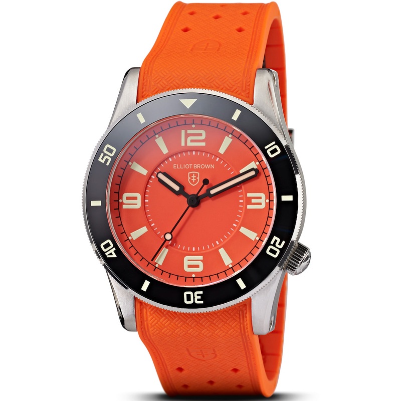 Elliot Brown Watch Bloxworth 3 Hand Diver 929-104-R55S. The Elliot Brown watches Bloxworth 3 Hand Diver is a beautiful dive watch inspired by classic watches from the 50s and 60s, demanding audience. Take the basketweave pattern; Elliot Browns take on the iconic Tropic watch straps incorporated neatly into the dials, case backs and soft deploymant rubber straps.