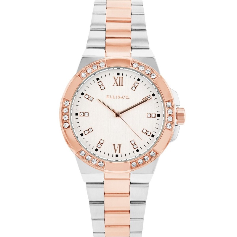This is a feminine and stunning Ellis & Co watch. ‘Alysa’ has a stone set bezel and dial with precious glimmer, and you’ll love the rose gold toned detailing. Fine hands and crafted roman numerals add a touch more elegance to the finish. – Precise Quartz Timekeeping – Splash Proof Water Resistance – Rose Gold Tone Stainless Steel – Stone Set Dial and Bezel