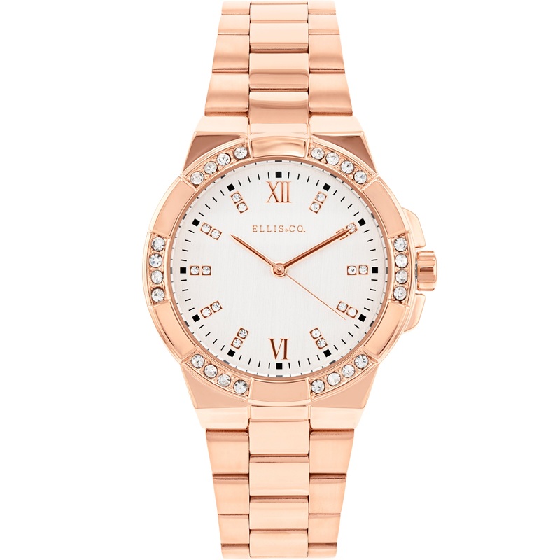 This lovely Alyse watch is one of Ellis & Co’s best. Flowing with crystals around its bezel and on the dial, its shine works well with the subtler rose gold plating. This timepiece is ready to make any outfit pop and will surely brighten up your day. – Precise Quartz Timekeeping – Water Resistant – Rose Gold Toned Stainless Steel- Mineral Crystal Glass