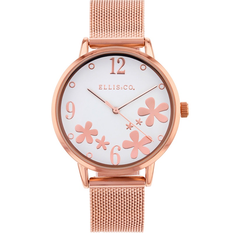 Ellis & Co are known around the world for their intricate designs and fashion-forward stance to watchmaking. The Ellis & Co Bloom womens watch features a rose gold plated stainless steel case and mesh band that combines the look of fabric and the luxurious feel of metal. The dial has been set with rose gold coloured cartoon-inspired flowers that add character to the watch.
