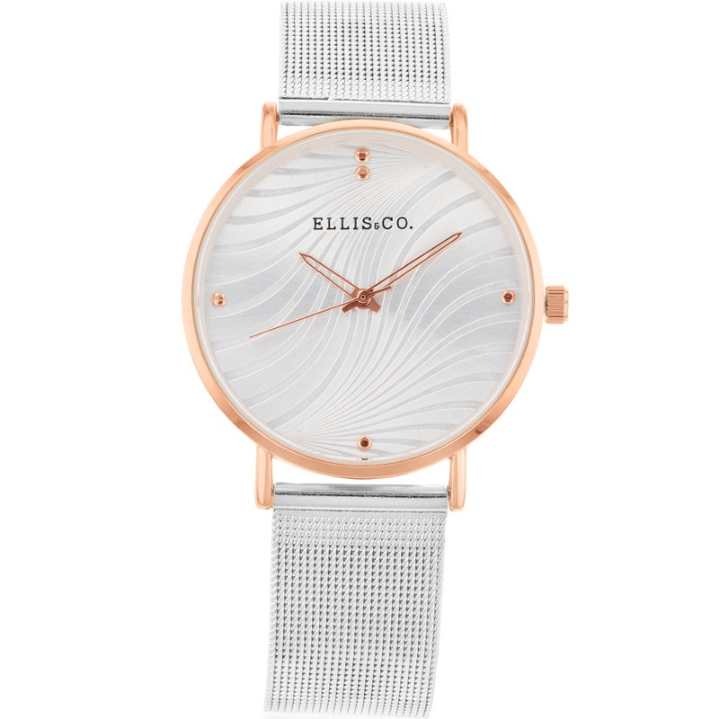 Get a light, airy look with this Ellis and Co ‘Eliza’ timepiece. Enjoy flowing crystal embossment against a spacey white and rose-gold dial. Its slim mesh bracelet is designed to fit you just how you want.