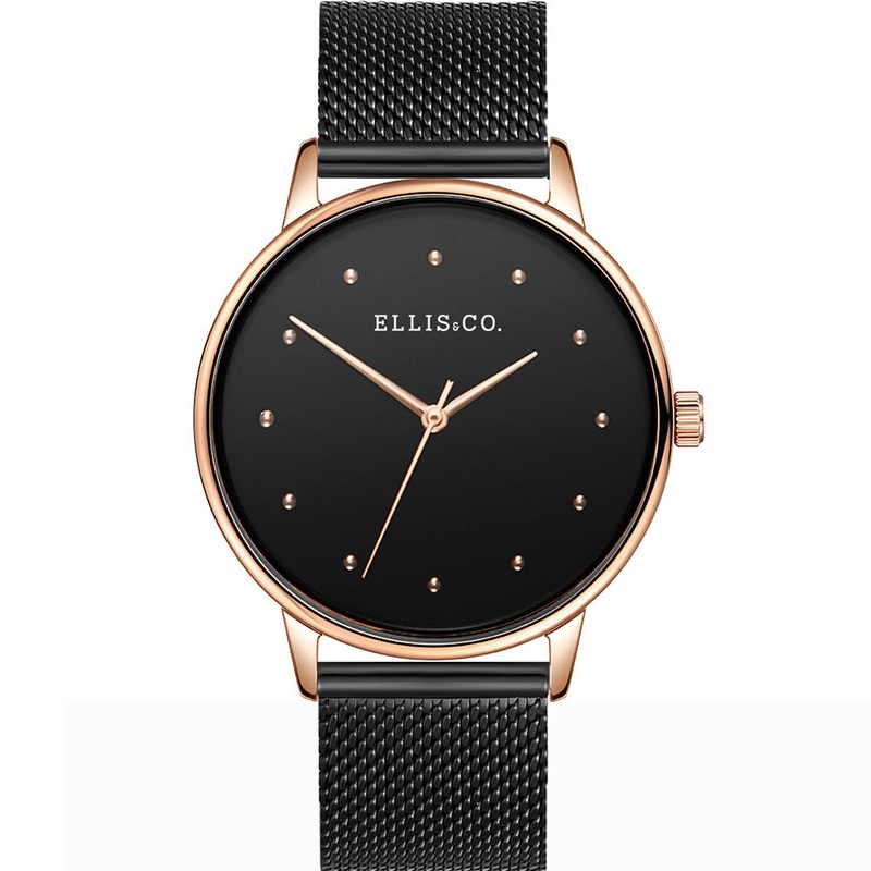 A stylish piece, this Ellis & Co Layla Black Mesh Womens Watch is minimalistic, yet elegant. Mesh bands are very popular right now as they are both comfortable, classy and stylish. Complete with intricate details in the mesh pattern, this watch conforms perfectly to the wrist. The high contrast between the black and rose gold is wonderful, and gives the piece a unique twist. Great for any occasion, this versatile watch is sure to elevate your look, whether it is at the office, a formal event or even worn casually.