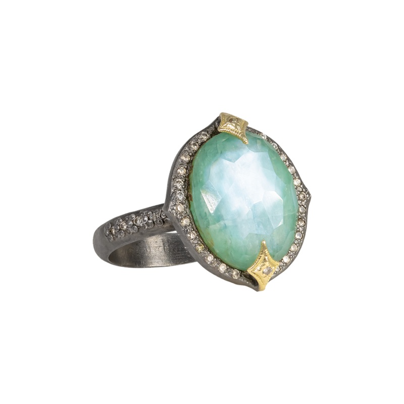 Ring 18k Yellow Gold and Blackened Sterling Silver with 0.16CT Champagne Diamonds 14×11 Oval Emerald.