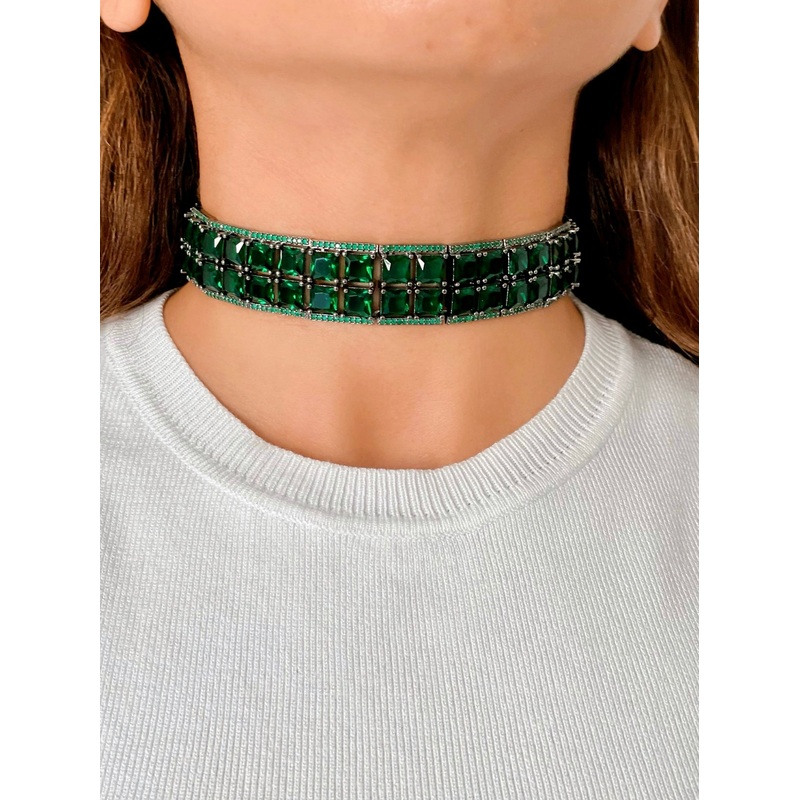 The Emerald Plenty Choker come an intricately detailed and finely studded with semi precious swarovski crystals stones set in a rhodium plating. These lightweight hoops can be carried effortlessly through your day to evening looks, adding a touch of elegance and royalty to your ensemble. They are a perfect for any occasion – from dinners to weddings to date night – these are the perfect fit for you.