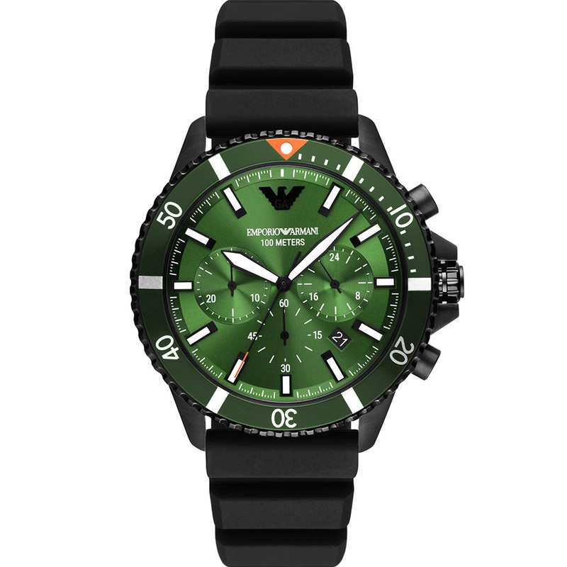 The Emporio Armani AR11463 Diver Chronograph combines sporty style with functional design, featuring a sleek black stainless-steel case paired with a comfortable black silicone strap. Its green sunray dial adds a bold pop of colour, enhancing its modern ae