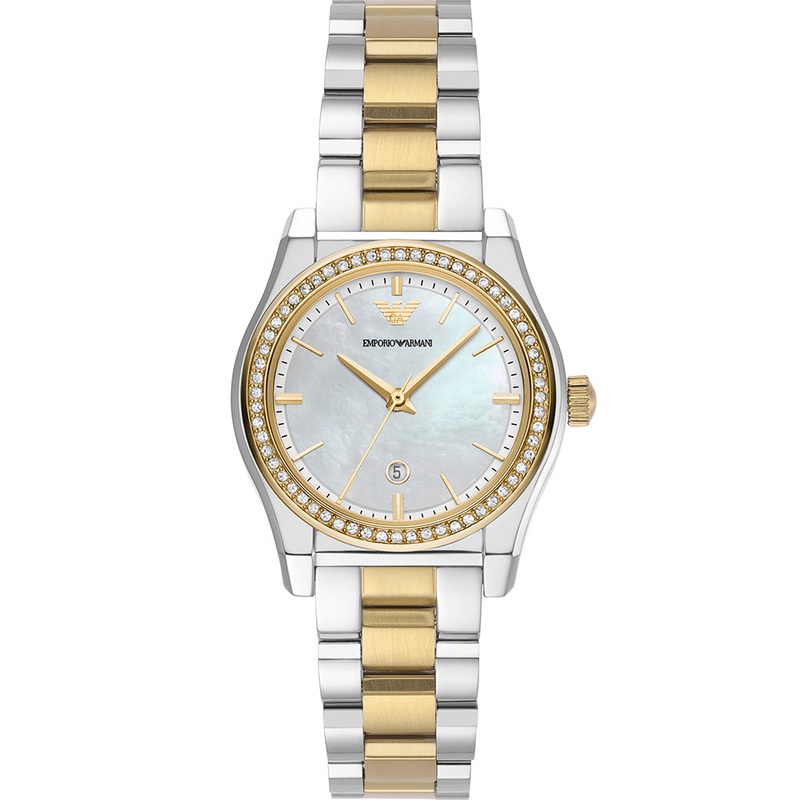 The Emporio Armani AR11559 Federica epitomizes elegance with its two-tone silver and gold stainless steel case and bracelet. Its mother of pearl dial, adorned with gold accents, adds a luxurious touch to its design, reflecting a spectrum of iridescent hues in different lights. Powered by a precise quartz movement, this timepiece ensures accurate timekeeping. With a modest 32mm case size and a comfortable 16mm band width, it offers a balanced fit on the wrist. Equipped with a practical date display and 50 meters water resistance, it combines functionality with style, making it a versatile accessory for both formal occasions and everyday wear.- Quartz Movement – 32mm Case Size – Stainless Steel Case and Bracelet – Mother of Pearl Dial – 16mm Band Width – Date Display- 50 Meters Water Resistant