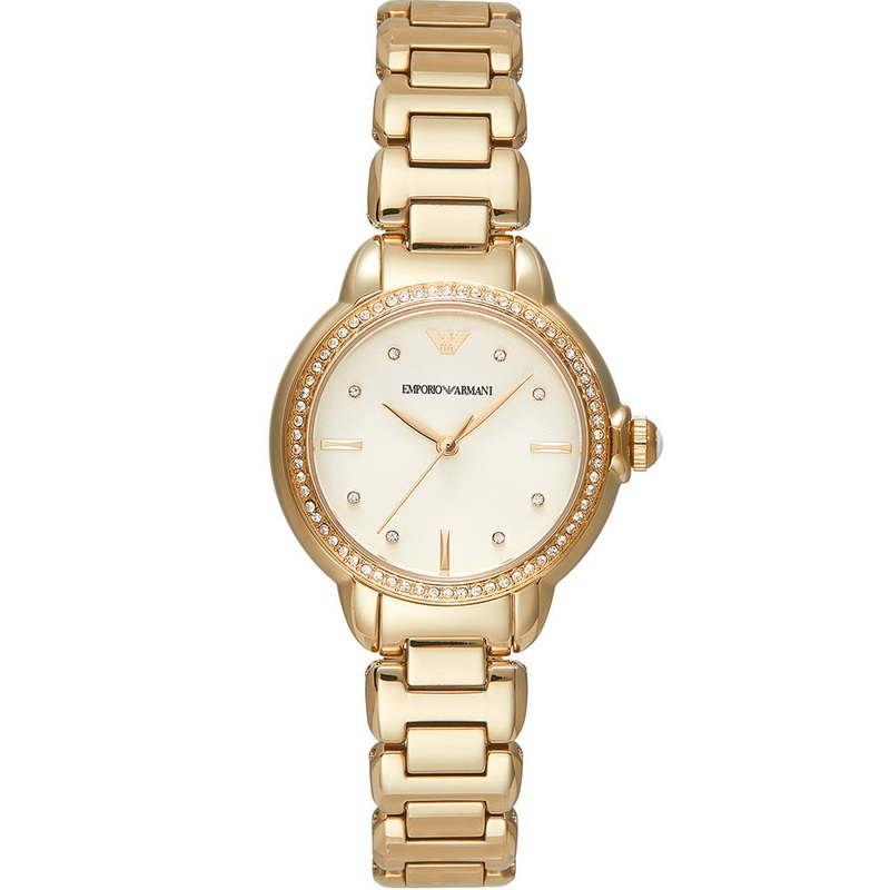 The Emporio Armani Mia AR11609 is a symbol of timeless sophistication and elegance. Crafted with a luxurious gold-tone stainless steel case and matching bracelet, this watch exudes opulence and refinement. The sleek black dial serves as a striking backdrop to the radiant gold tones, creating a harmonious and sophisticated aesthetic. The minimalist design features subtle hour markers and the iconic Emporio Armani logo at 12 o’clock, adding a touch of signature style. Powered by a precise quartz movement, the AR11609 ensures accurate timekeeping. Whether worn for special occasions or everyday elegance, this watch effortlessly elevates any ensemble with its chic and versatile design.- Quartz Movement – 32mm Case Size – Gold-Plated Stainless-Steel Case and Bracelet- Mineral Crystal Glass- 50 Meters Water Resistant
