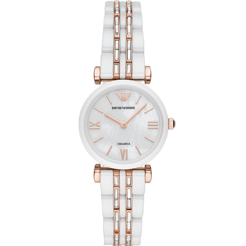 The Emporio Armani AR70004 Gianni T-Bar blends sophistication with a touch of modern elegance, featuring a pristine white ceramic case and a striking white and rose gold ceramic-stainless steel bracelet. Its mother of pearl dial, adorned with rose gold accents, offers a luminous and luxurious appeal. Powered by a quartz movement, this timepiece ensures accurate timekeeping. With a delicate 28mm case size and a comfortable 14mm band width, it exudes refined femininity. Designed for everyday wear, it includes 30 meters water resistance, providing protection against splashes and light rain. This watch effortlessly combines style and functionality, making it a perfect accessory for both formal occasions and everyday sophistication.- Quartz Movement – 28mm Case Size – 14mm Band Width – Ceramic Case – Ceramic and Stainless-Steel Bracelet – Mother of Pearl Dial- 30 Meters Water Resistant
