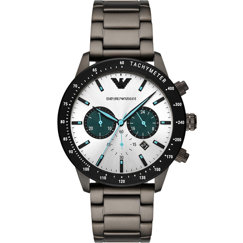 Presenting the Emporio Armani AR11471, a two-tone silver and black mens watch that has been crafted from durable stainless steel. The bezel is matte black with white indices, the white compliments the silver dial perfectly. The watch has been set with three subdials, blue hour hands and indices.