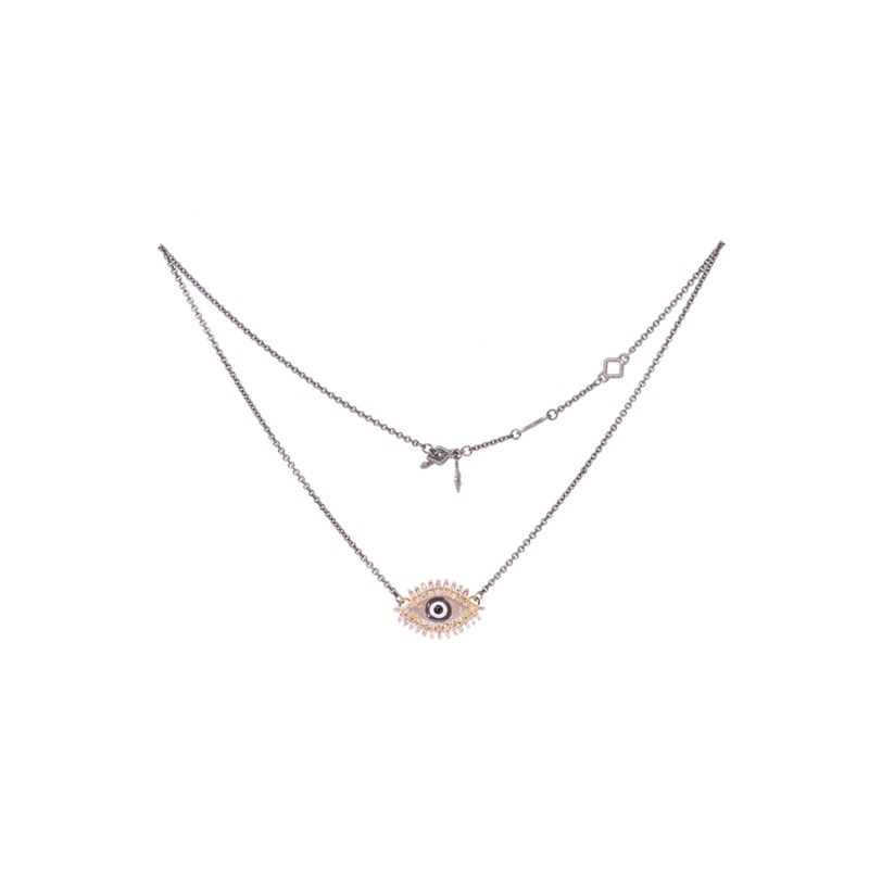 Necklace 14kt Rose Gold and Grey Sterling Silver eye enamel with 0.184 CT White diamonds and Morganite. Adjustable 16″,17″ and 18″.