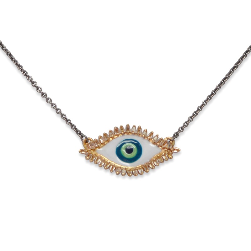 14k Rose Gold and Blackened Sterling Silver necklace with enamel red card/sena green/white/petrol green(black), sapphire baguettes and champagne diamonds. Adjustable 16”, 17″, and 18″.