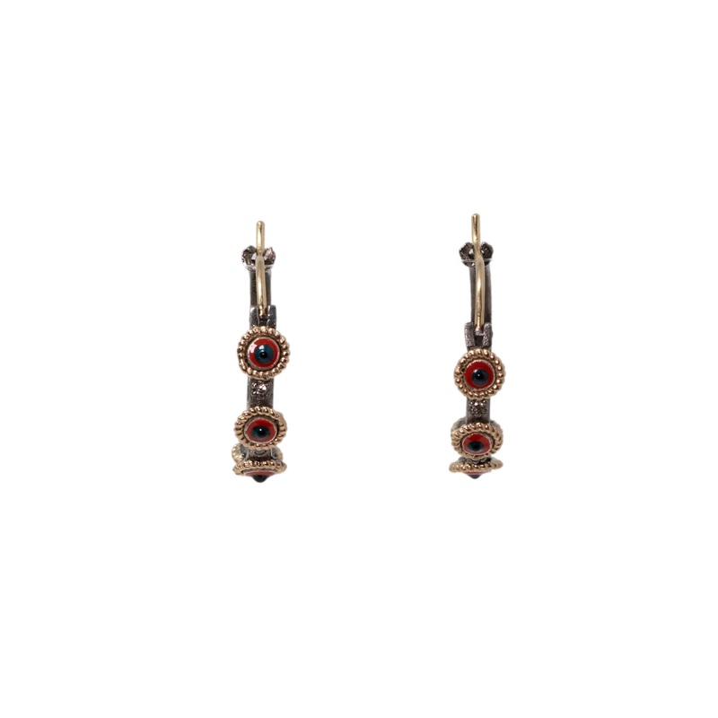 14k Rose Gold and Blackened Sterling Silver 25mm mm side hoop evil eye earrings in Dark Blue, Coral, and Black enamel with champagne diamonds.