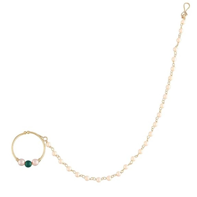 This traditional nose pin is crafted in gold-plating and features Pearl beaded clip-on nose ring with chain, connecting to a hook closure. Style this nose pin with your ethnic attires for festive ready look. No piercing required. Perfect Accessory for ever