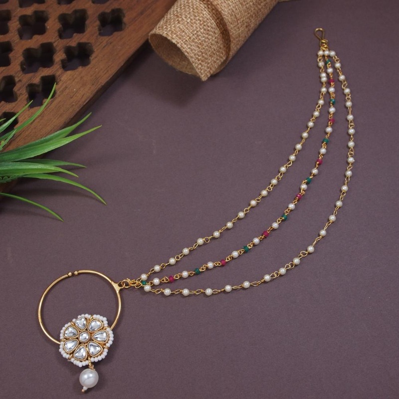 Celebrate your wedding day with this luxurious gold-plated traditional nose ring/nath. Featuring a non-piercing design and a striking multilayered pearl chain, this piece adds an opulent touch to your bridal look. The intricate detailing and elegant pearl layers ensure you shine with timeless grace and beauty. This elegant gold-plated nose ring/nath is designed for the bride who appreciates traditional beauty with a modern twist. The multilayered pearl chain adds a sophisticated flair, creating a cascading effect that enhances your bridal attire. The non-piercing feature ensures comfort while you exude timeless elegance.