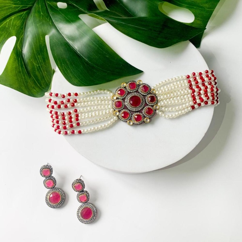 The silver-plated choker necklace set consists of a necklace, a pair of earrings. The necklace features kundan studded with pearl beaded in it, giving it an elegant and traditional look. The stones and pearls are set in a beautiful pattern, adding a touch of sophistication and grace to the necklace. The necklace is secured with drawstring closures, which make it easy to adjust the size to fit comfortably around the neck. This is an important feature, as it ensures that the necklace will be comfortable to wear for extended periods of time. The necklace is secured with drawstring closures, which make it easy to adjust the size to fit comfortably around the neck. This is an important feature, as it ensures that the necklace will be comfortable to wear for extended periods of time. The earrings and maang tikka are also adorned with stones and pearls, which match the pattern of the necklace. The earrings have a beautiful design, which makes them easy and comfortable to wear. The maang tikka is a traditional Indian hair accessory that can be worn with the necklace and earrings to complete the look.