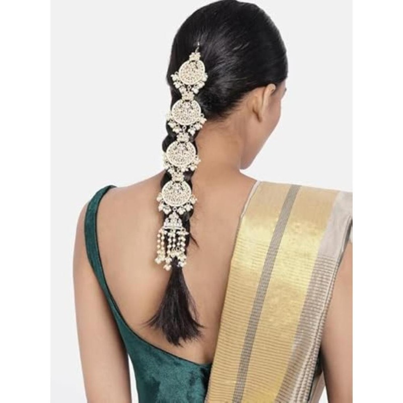 Introducing our exquisite Gold Plated Traditional Handcrafted White Kundan and Pearl Studded Paranda, a stunning hair accessory that will enhance your bridal look and add a touch of elegance to any special occasion. Crafted by skilled artisans, this Paranda is made with high-quality materials to ensure durability and longevity. The gold plating and intricate Kundan work are sure to catch everyone’s attention, while the pearl studded detailing adds a touch of sophistication and glamour. The Paranda is designed to be attached to the end of your braid or hair, making it the perfect accessory for bridal hairstyles, festivals, or any formal occasion. The classic white Kundan stones and pearls create a beautiful contrast against any hair color, making it a versatile accessory for all skin tones. Measuring approximately 9 inches in length, this Paranda is lightweight and easy to wear. Its sturdy clasp ensures that it stays securely attached to your hair throughout the event, allowing you to dance and move with ease. The Paranda comes in a beautiful traditional design, making it a perfect gift for brides, bridesmaids, or anyone who appreciates the timeless beauty of traditional Indian jewelry. It also comes with a beautiful gift box, making it ready for gifting and safekeeping. Overall, our Gold Plated Traditional Handcrafted White Kundan and Pearl Studded Paranda is the perfect accessory to complement your bridal look or add a touch of sophistication to your hairstyle. Order now and experience the beauty of this traditional Indian accessory!