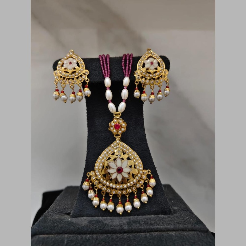 This exquisite necklace set features a timeless design with intricate Jadau gold plating and dazzling Pota stone and pearl accents. Crafted with attention to detail, this necklace set exudes elegance and luxury. Elevate any outfit with this everlasting piece. Note: Image may be vary slightly from the actual product.
