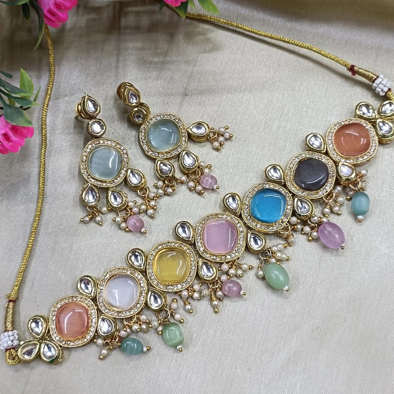 This exquisite necklace set from the Exotica Collection features a 2 tone plated design adorned with sparkling Kundan stones and lustrous pearls. Elevate your style and add a touch of elegance to any outfit with this stunning choker necklace set. Perfect for any formal occasion, guaranteed to make a statement…..Note: Image may be vary slightly from the actual product.