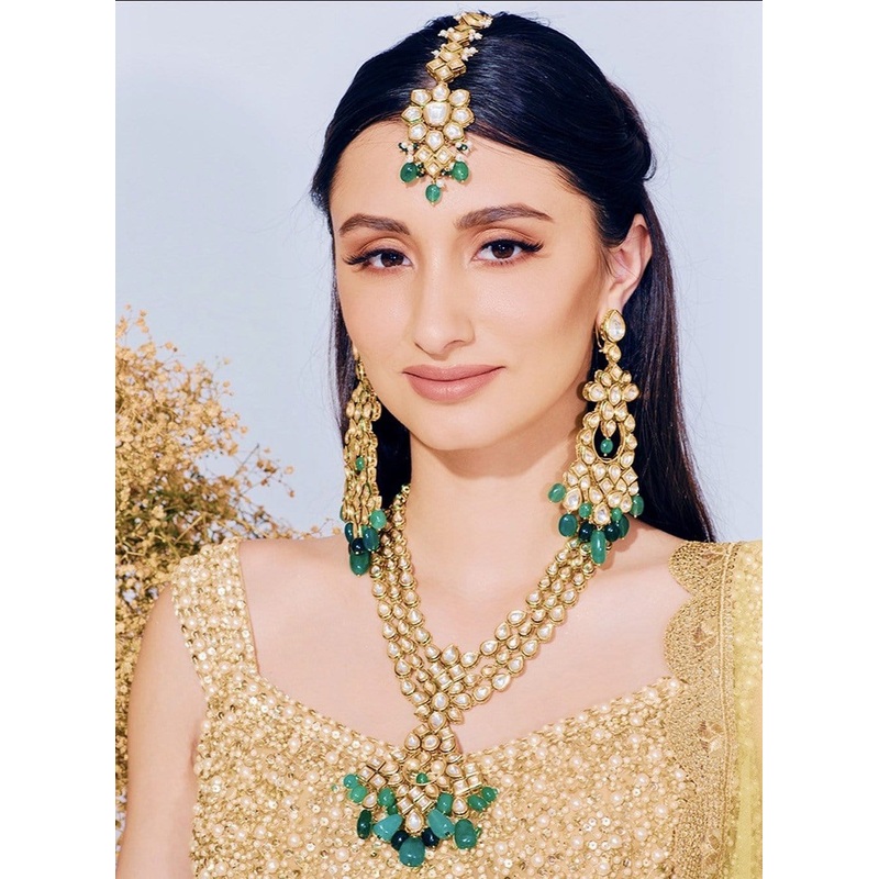 Adorning your head beautifully, the Faizana maang tikka accented with kundan and delicate pearl and green beads is sure to get lots of compliments your way.
