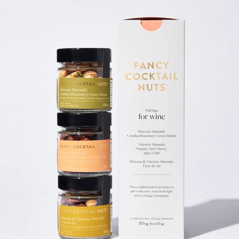 Three sophisticated nut mixes to pair with every wine from light red to vintage champagne Marcona Almonds, Candied Rosemary, Green Raisin Valencia Almonds, Organic Tart Cherry, Spicy Chili Marcona and Valencia Almonds, Sea Salt do not use any products that