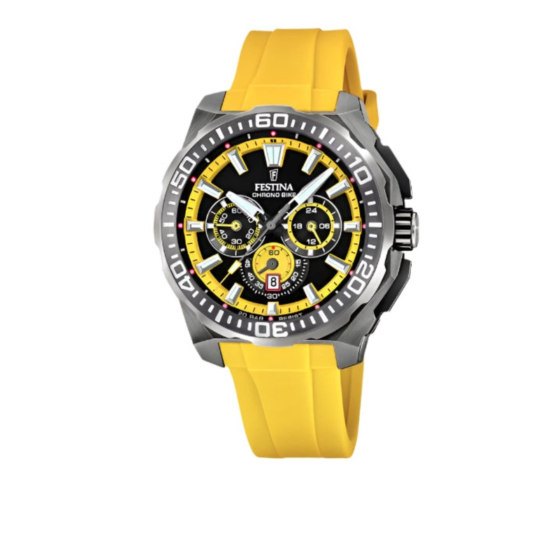 Bold and performance-driven, the Festina Chrono Bike Yellow Rubber Strap Watch f20725/1 is a men’s watch that blends sport-inspired aesthetics with precision engineering. Crafted from durable 316L stainless steel with a 45.5 mm case, it features a striking black dial accented by luminous hands and vivid yellow detailing, all protected by a resilient mineral crystal. The vibrant yellow rubber strap ensures a secure and comfortable fit while elevating its dynamic style. Powered by a Japanese MIYOTA OS20 quartz movement, it offers chronograph functionality, a date display at 6 o’clock, and 20 ATM water resistanceideal for active lifestyles. A standout in the watches category, this timepiece delivers high-performance utility with contemporary flair, perfectly suited for cycling, swimming, or everyday wear.