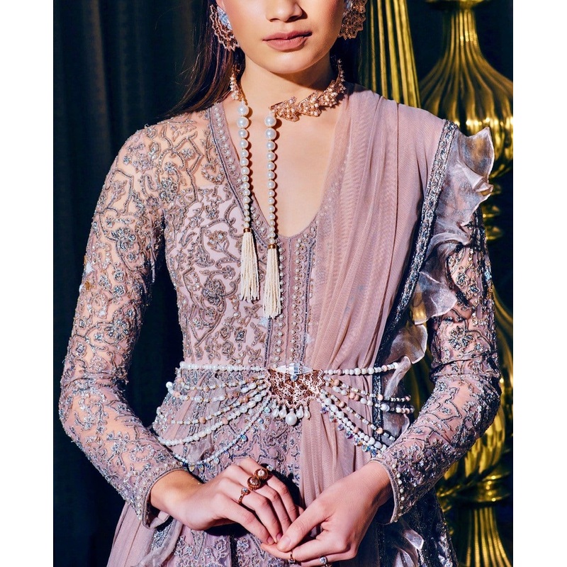 Perfect to style on saris to lehengas, the Fevronia will instantly accentuate your outfit and give it a sparkling finished look. Strung with pearls, crystals and beads, the waist belt is finished with a beautiful centre piece.