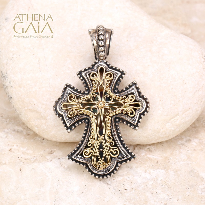 Elevate your everyday wardrobe with our Filigree Flared Cross. Crafted from 18k gold and sterling silver, this delicate piece exudes elegance and refinement. Perfect for baptisms, special events, or adding a touch of luxury to your daily attire.