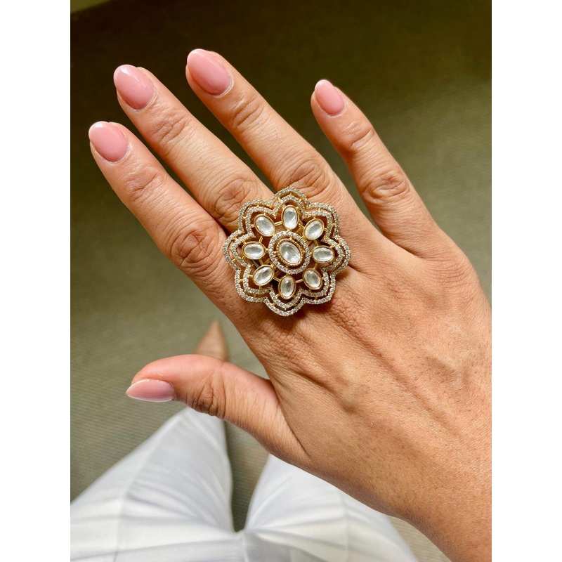The Kiara Ring is from the Indian Collection.Handcrafted in-house and set with pearls, kundan and green stones, the Kiara Ring will make you stand out at any festive or party event!We think it works well with both Indian and contemporary looks.Discover exq
