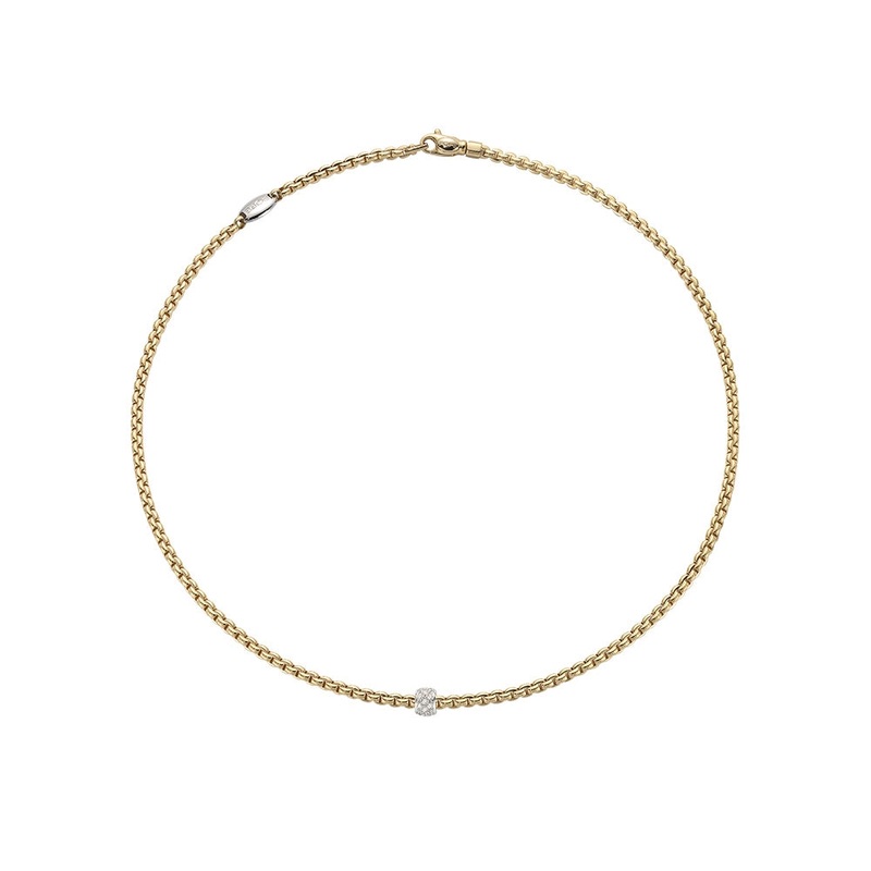 Ladies Fope necklace. 18 karat yellow gold. Eka Tiny collection pave’ diamond necklace with one white gold diamond rondel, diamond total weight of 0.19 carat, 18 inch length.