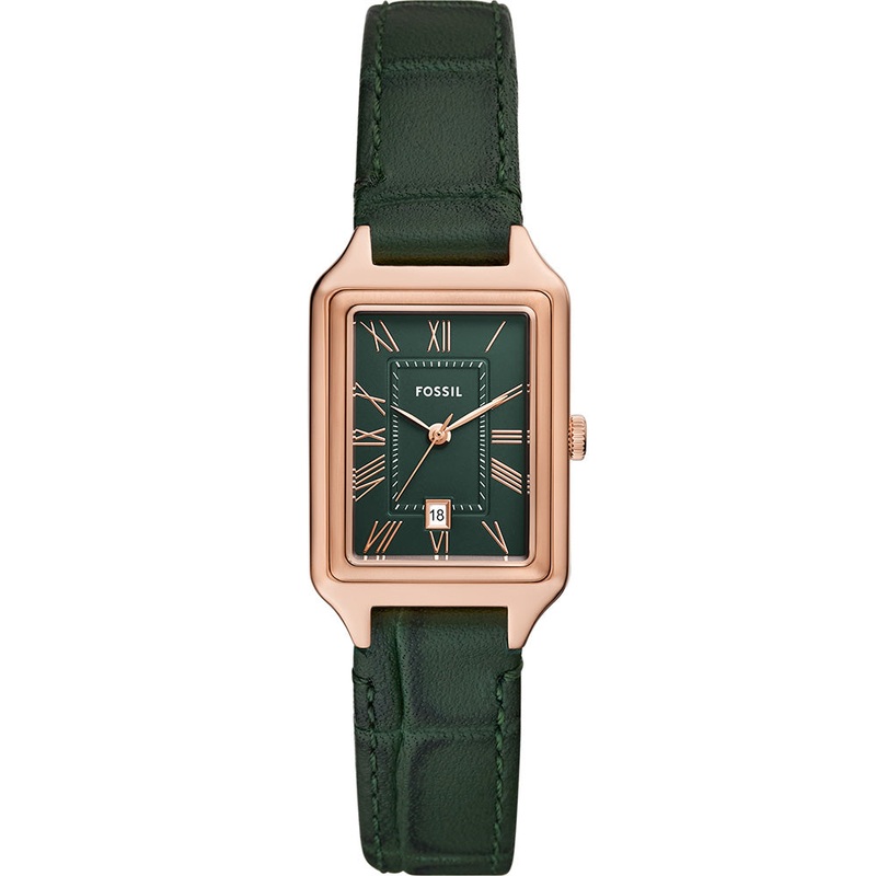 The Fossil ES5366 Raquel brings a touch of luxury with its rose gold rectangular case and matching bezel. The 23mm case frames a vibrant green dial, powered by precise quartz movement and featuring a handy date display. The watch is completed with a coordinating green leather strap, 12mm in width, for a chic and comfortable fit. With a durable mineral crystal and 50 meters of water resistance, the Raquel combines elegant design with practical functionality.- Quartz Movement – 23mm Case Size – Stainless Steel Case – Leather Strap- 12mm Strap Width – Mineral Crystal – Date Display – 50 Meters Water Resistant