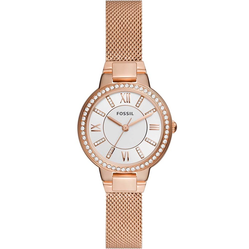 Plated in rose gold, this Fossil ES5111 Virginia Womens Watch is a beautiful choice for formal wear and everyday use. Its thin band is designed in a mesh style that's flexible and perfectly feminine. A small bezel fits the strap flawlessly, set with gliste