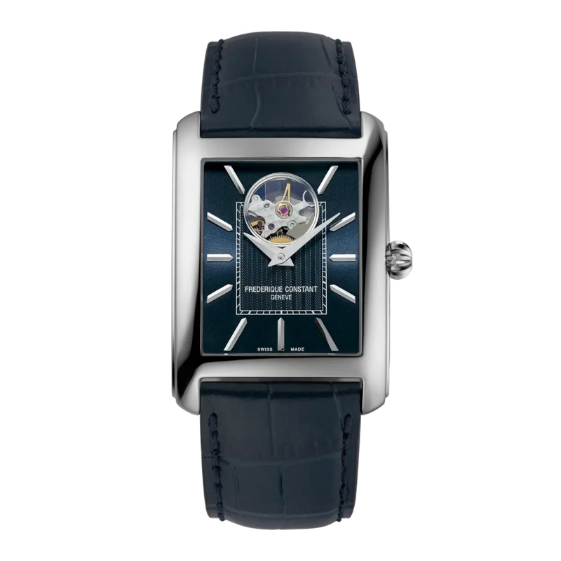 The Frederique Constant Carree Heart Beat Automatic FC-311N4C6 is a remarkable timepiece that showcases a brilliant combination of timeless elegance and contemporary design. With a discreet opening at twelve o’clock, the watch reveals its beating heart, adding a touch of innovation to its iconic Art Deco case. This genius invention is complemented by the visible escapement, housed at 12 o’clock, further solidifying the Maison’s position as a classic watchmaking manufacturer. Boasting a power reserve of 38 hours, this automatic watch features an embossed and sunray blue dial, completing its sophisticated appearance. The strap is made of calf leather with a crocodile pattern, adding a touch of luxury to this truly impressive Frederique Constant watch.