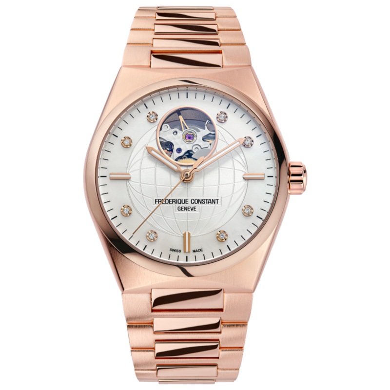 The Highlife Ladies Automatic Heart Beat models capture the legacy of the Manufacture and carry it toward new creative horizons. At 12 oclock, the pieces proudly display the window on their mechanical heart, made famous by Frederique Constant. Known as the Heart Beat, it lets you see the beating heart of the watch, its mechanical movement. It also reveals some essential components of Swiss Made precision.