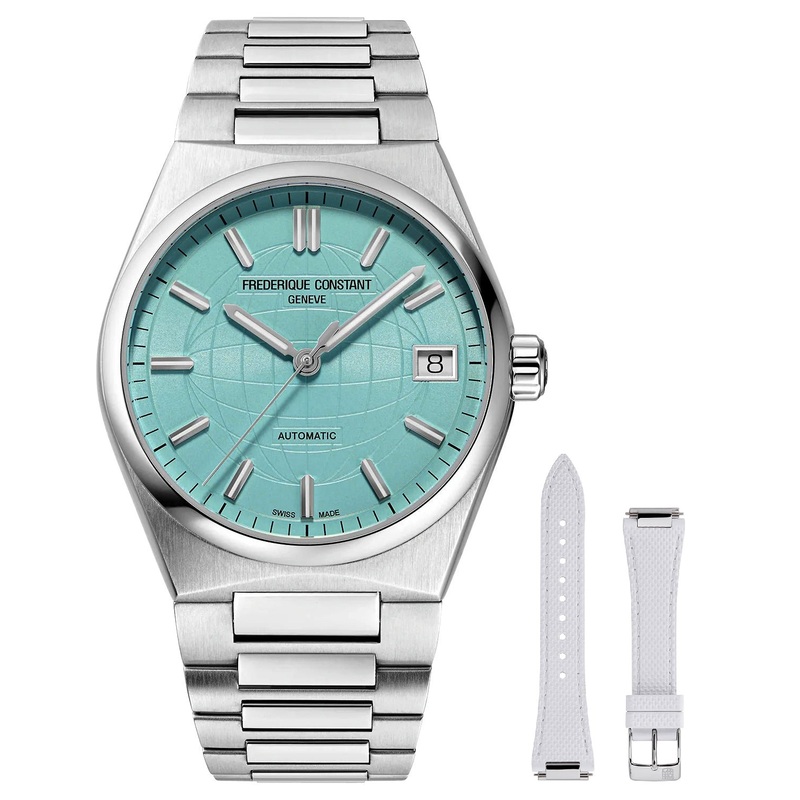 Launched over 20 years ago and based on revised and improved fundamentals acquired from Frederique Constant’s lengthy experience, the Highlife collection sports a new case design, interchangeable straps and a detailed, decorated dial. This Ladies’ Highlife features a modest 34 mm stainless steel case that holds a gorgeous turquoise blue dial under a scratch-resistant sapphire crystal. It has silver-tone and luminescent pencil hands and applied indices as hour markers along the perimeter of its central globe motif. A beveled date window is located at the 3 o’clock position adjacent to its fluted crown. This watch is equipped with a stainless steel bracelet that sports a smoothly integrated design and is secured by a folding clasp with push buttons. It also comes with an interchangeable white rubber strap for a variety of looks. This watch has an exhibition caseback showcasing the caliber FC-303, a Swiss automatic movement and is water-resistant up to 50 meters/165 feet.