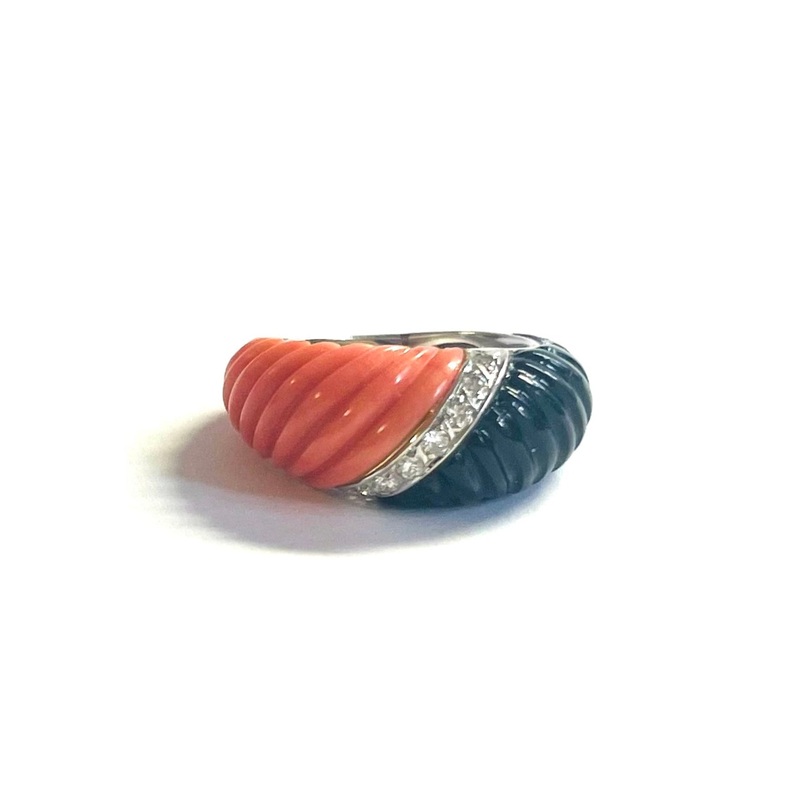 This vintage ring is a product of the 1970s design period. It features coral and onyx, set with 8 brilliant-cut diamonds totaling approximately 0.20 carats. The ring has a total weight of 7 grams and is made from 18kt white gold. This piece comes in a US size 5.5.