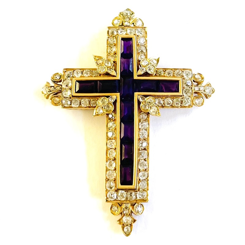 This amethyst cross pendant features 11 amethyst baguettes set in an 18KT yellow gold frame, surrounded by 82 old mine diamonds weighing approximately 3.20 carats. The pendant bears a French import mark and weighs a total of 20 grams. With measurements of 6.5 x 5.0 cm, this antique-designed piece is both elegant and timeless.