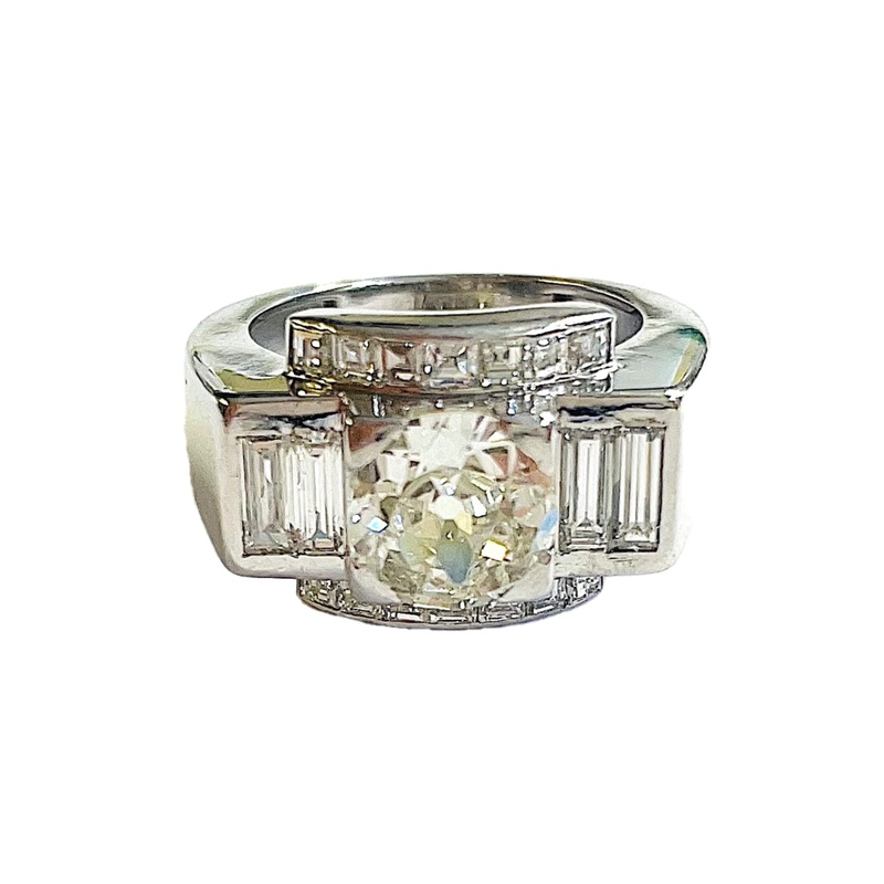 This vintage French Art Deco ring is made from platinum and features a central light yellowish VS diamond of approximately 1.16 carats, along with 4 baguette-cut and 14 care-cut diamonds totaling around 1.30 carats. The total weight of the ring is 10 grams, it measures about 1.2 x 1.7 cm at the top, and fits a US size of 5.25.