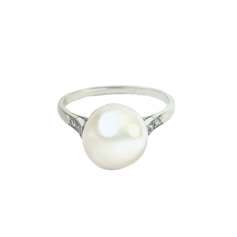 This French Oriental pearl ring is a vintage piece from the Edwardian design period. The ring features a natural pearl, weighing approximately 6.8 ct, set in platinum and accented with four small old mine cut diamonds. With a total weight of 4 grams and a ring size of 6.5 (US), this ring showcases exquisite craftsmanship and timeless elegance. This ring comes with an LFG report stating the pearl is natural saltwater