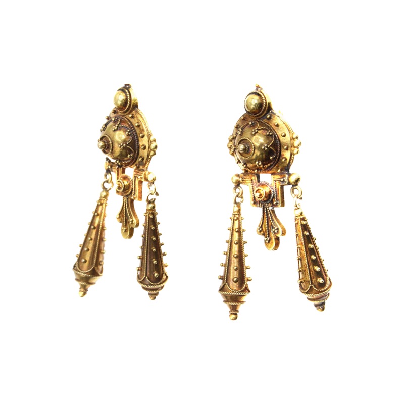 These French Etruscan Revival earrings are a unique find from the Victorian era, circa 1880. The earrings feature intricate gold bead detailing and bear French maker’s marks on the hooks. Made of 18kt yellow gold, each earring measures 0.65 inches in width and 1.5 inches in length, making them an elegant statement piece for any jewelry collection.