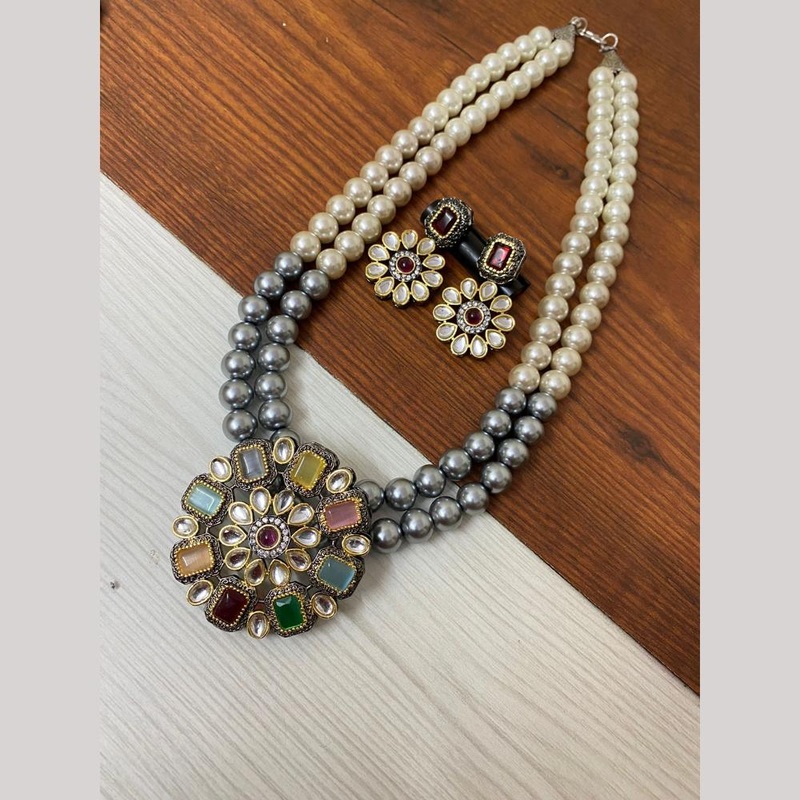 Featuring a premium two-tone plating a beautiful blend of gold and silver finishes this necklace set brings out the intricate beauty of traditional Kundan work, enhanced with multi-color accents that add vibrancy and versatility. The colorful stones are ta